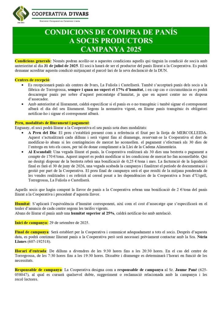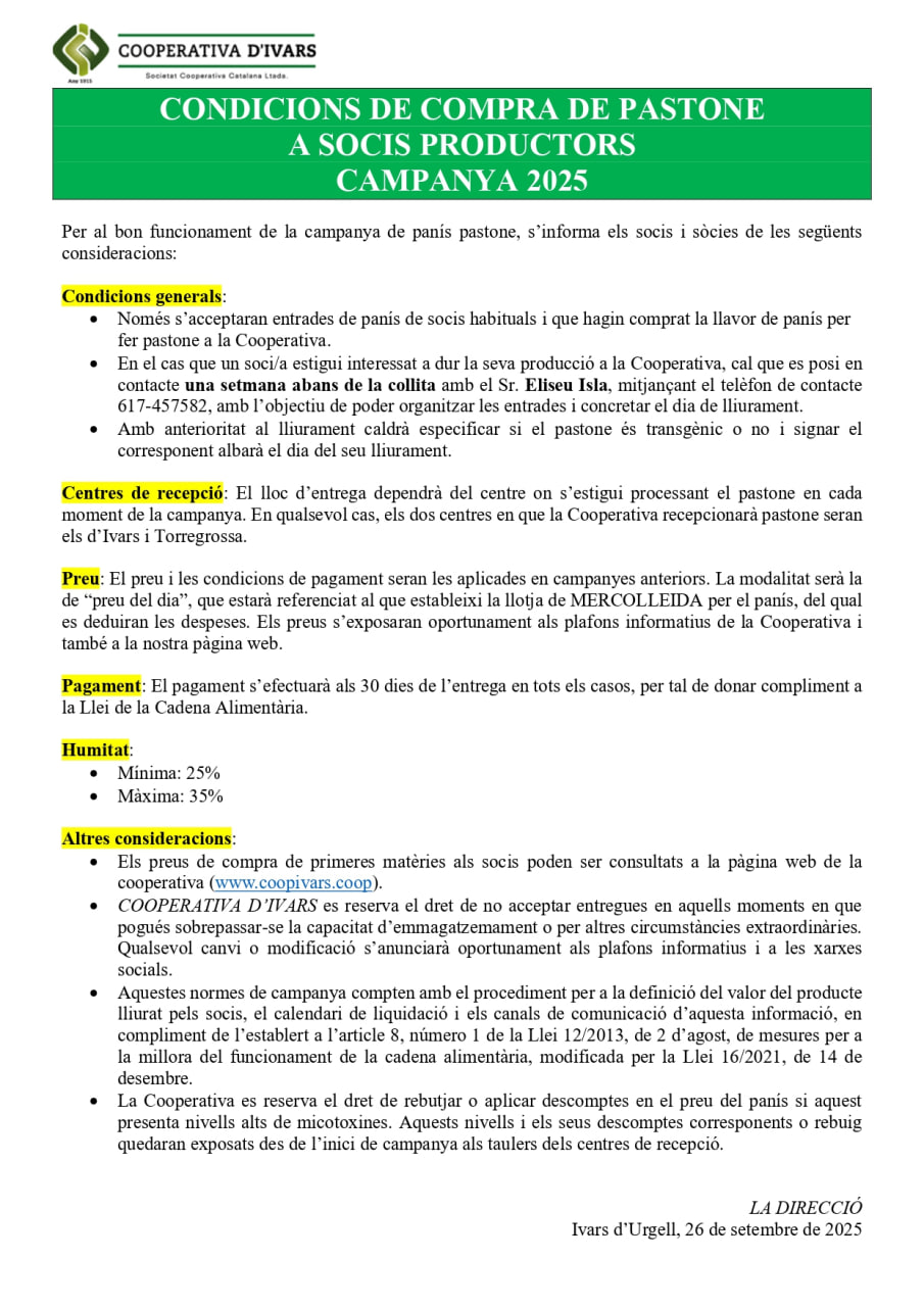 Adjuntamos las condiciones de la compra de maíz y pastone de la campaña 2025 para los socios productores de la Cooperativa, que han sido aprobadas por el Consejo Rector el día 25 de septiembre de 2025.