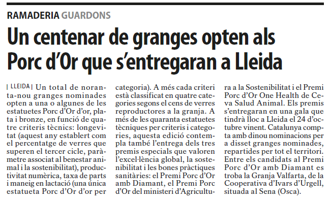 Una vez más la Granja Valfarta, una explotación ganadera de cerdas reproductoras que la Cooperativa tiene en Huesca, opta a ser reconocida con el Porc d’Or y Diamante en la Gala de premios Porc d’Or, que tendrá lugar en Lleida el próximo 24 de octubre. Un galardón organizado por el IRTA, que busca reconocer a las mejores granjas de porcino de capa blanca del territorio nacional en función de cuatro criterios técnicos: longevidad (este año establecido como el porcentaje de cerdas que superan el tercer ciclo, parámetro asociado al bienestar animal y la sostenibilidad), productividad numérica, tasa de partos y manejo en lactación.